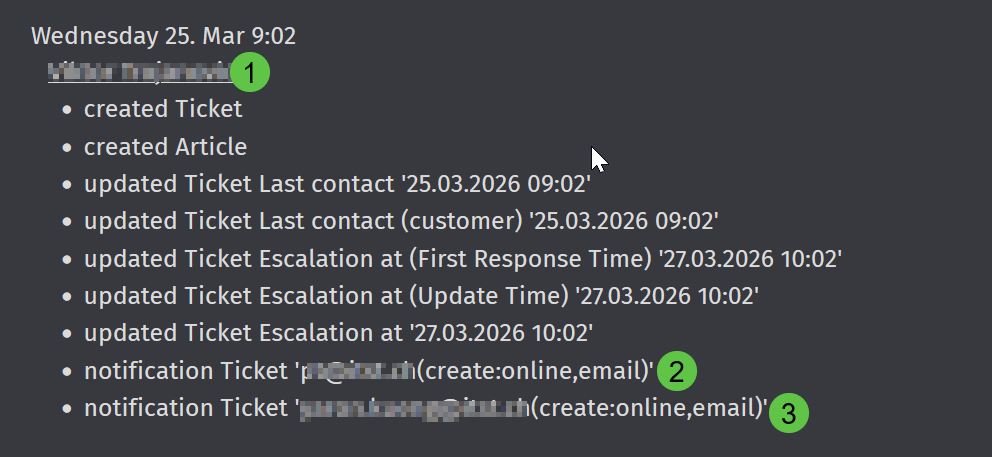 The history shows correctly that I created the ticket (button 1). But it does not state who it was assigned to. The assigned person ways sent a notification apparently (button 2). For whatever reason, another agent, apparently, was also sent a notification even though he is not mentioned in the ticket (button 3).