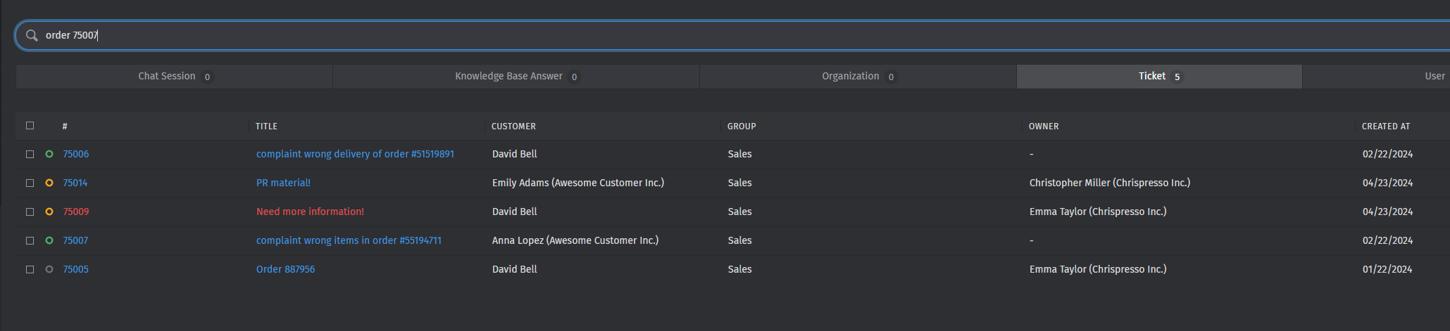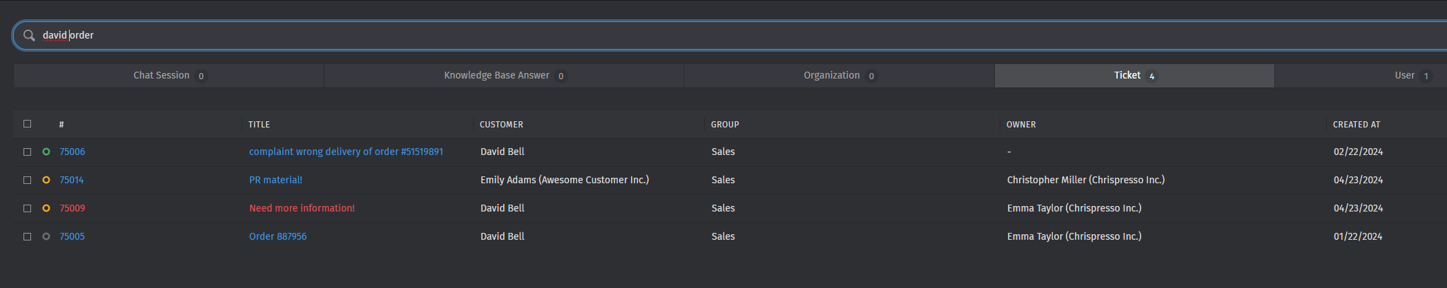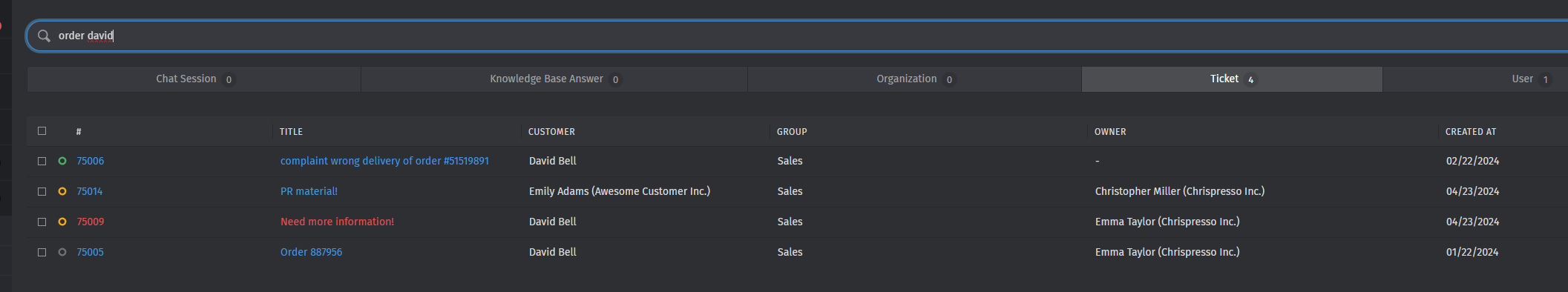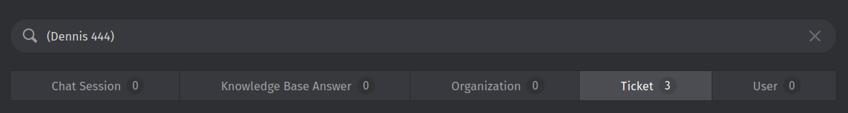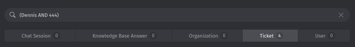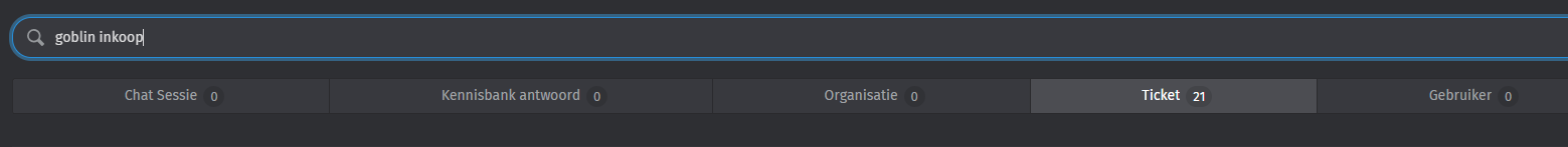 Instead of narrowing it down, almost all relevant results disappeared, leaving just one result instead. All 20 tickets from / about White Goblin Games disappeared. The word ‘goblin’ is in the sender and also in the ticket text itself (they use it in their signature).