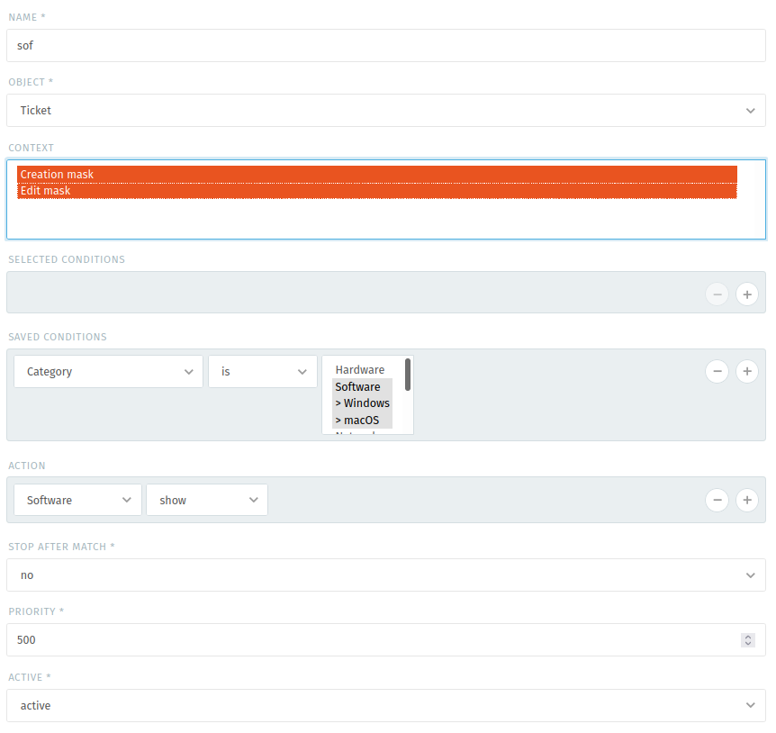 Then I set up a workflow to show the object Software (type select) when the user choose software but it still doesn’t show it on the ticket (I tried putting it in both the Selected conditions and saved conditions but neither of them worked)