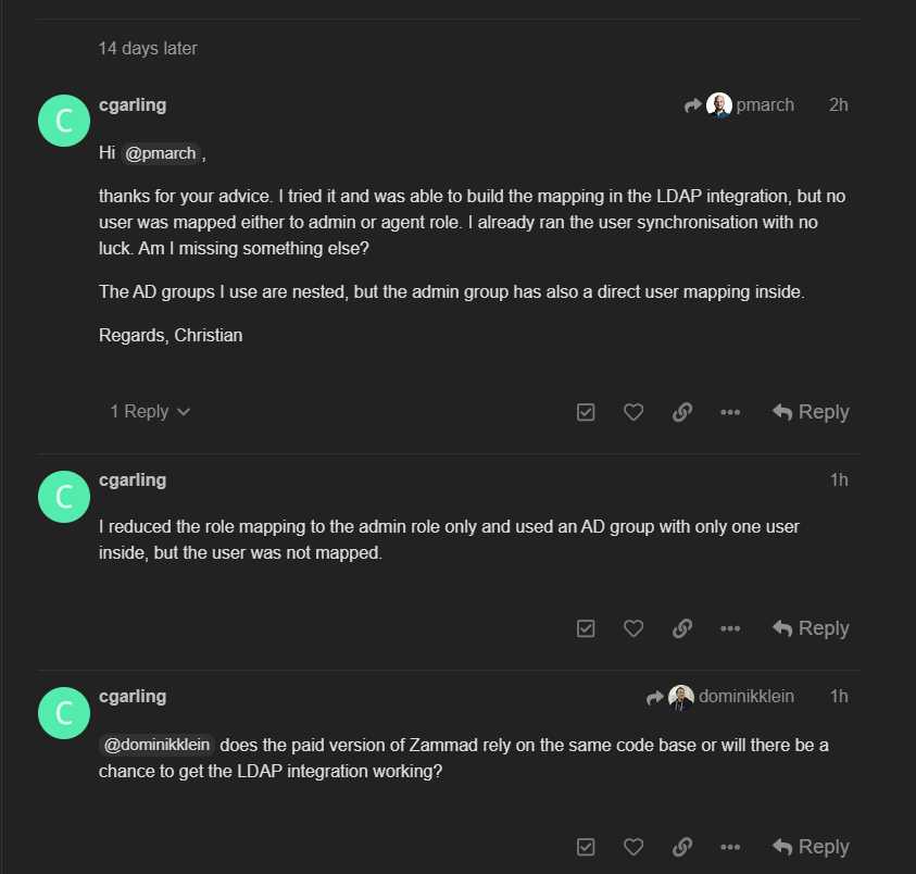 thanks for your advice. I tried it and was able to build the mapping in the LDAP integration, but no user was mapped either to admin or agent role. I already ran the user synchronisation with no luck. Am I missing something else?