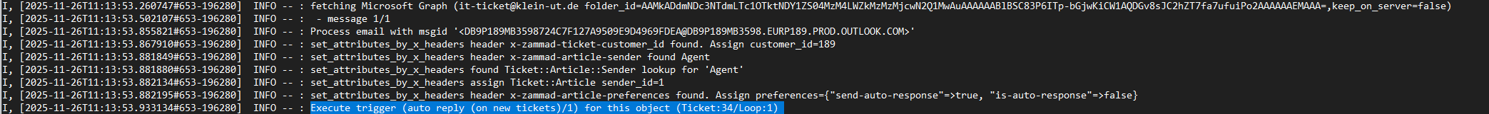 I send a mail to zammad via Office 365. Microsoft 365 Graph Connector is configured and set to group. The new ticket apears in zammad, but no autorespond. When I look in logfile I found this: