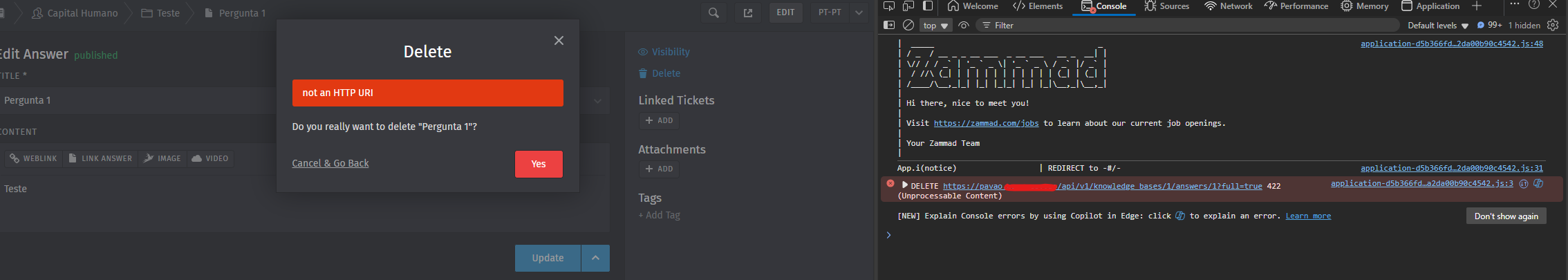 - When trying to delete a question in the Knowledge Base the following message appears: not an HTTP URI. The same happens if I try to delete the Knowledge Base.