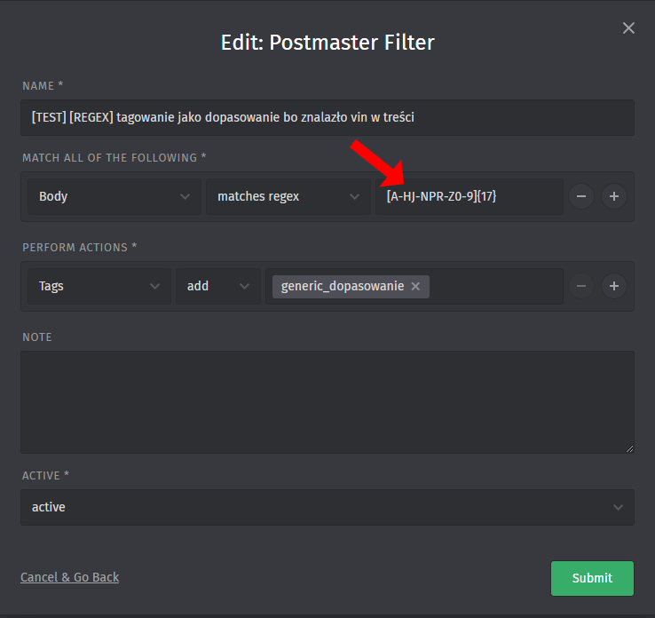 The regex filter does not seem to work within Zammad’s postmaster. Even though I have verified the regex on regex101 using the ECMA (JavaScript) flavor — which confirms that it correctly matches the sample VIN — Zammad does not recognize or trigger the filter when processing incoming emails.