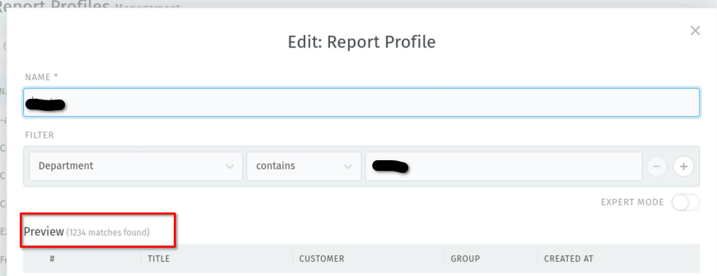 In the “Edit: Report Profile” view, the filters seem to work. The ticket count is shown correctly, and we can see a preview of some tickets.