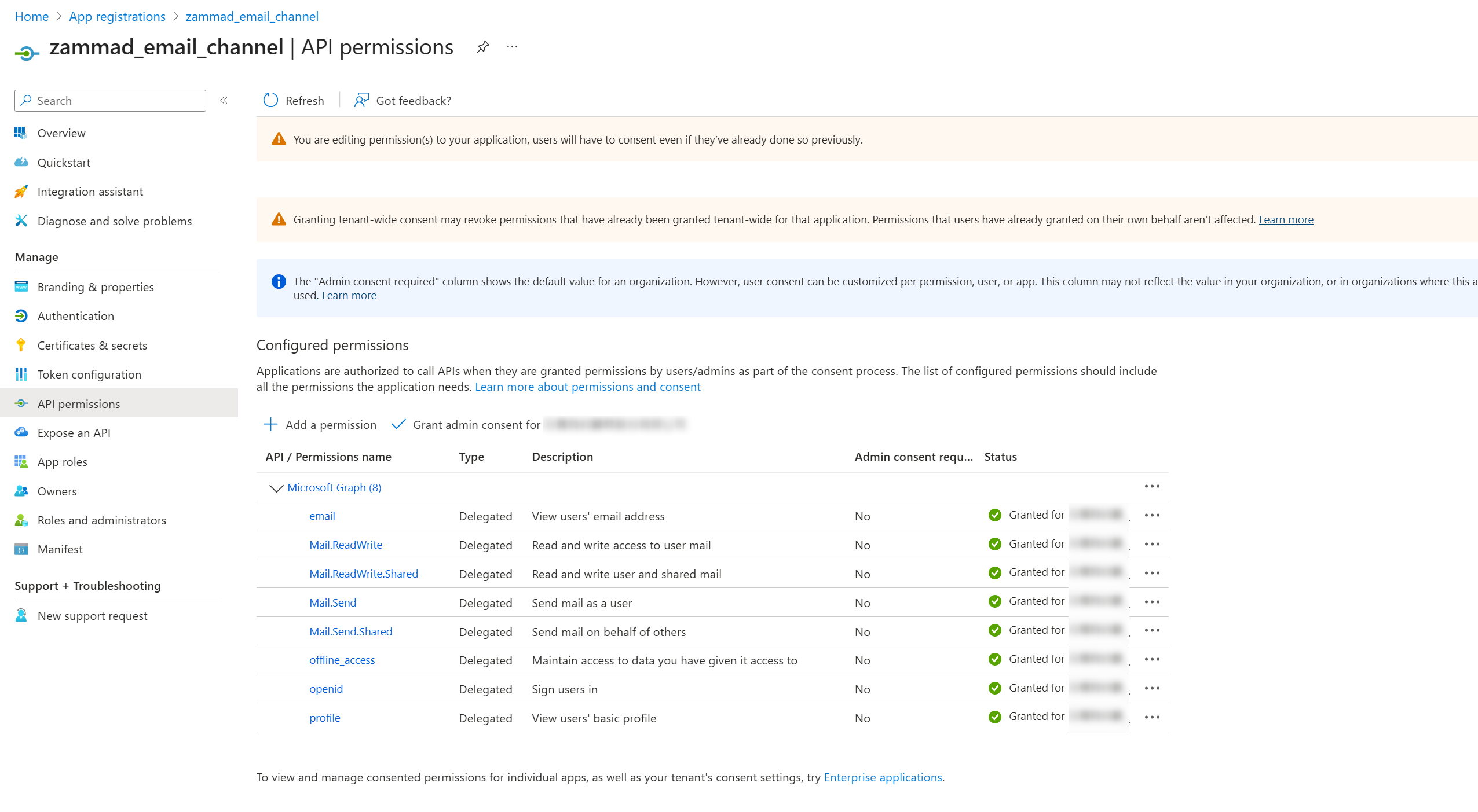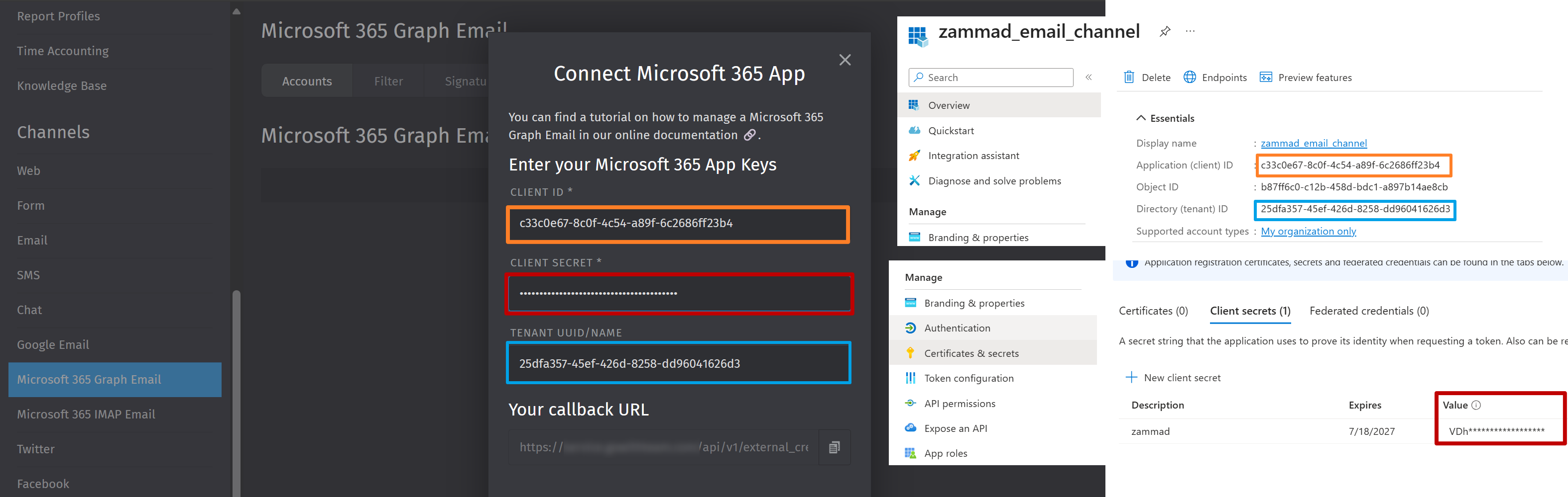 Successfully follow the admin documentation to connect a Microsoft 365 account via Graph API to Zammad.
