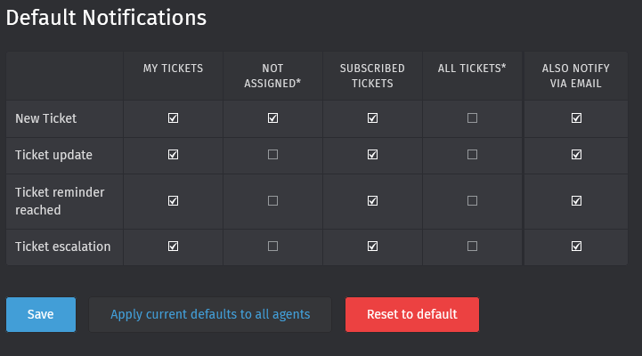 Every agent has “Not Assigned” unchecked in the “Ticket Updated” column, but I’m not sure what that actually does, because even with it unchecked, they still get email updates about tickets that are not assigned to them.